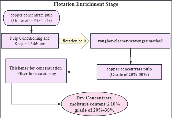 After reagent addition, the pulp enters flotation cells or tanks. Copper minerals are separated from the gangue using a rougher-cleaner-scavenger method. Through flotation enrichment, you can obtain copper concentrate pulp with a grade of 20%-30%.