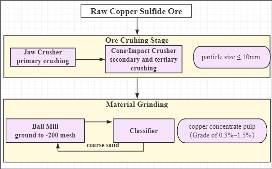 Copper sulfide run-of-mine ore generally has a low grade (typically 0.5%-3%), making direct smelting very costly. The first step in extracting copper from copper sulfide ore is crushing and grinding the raw ore to liberate copper mineral particles from the gangue.