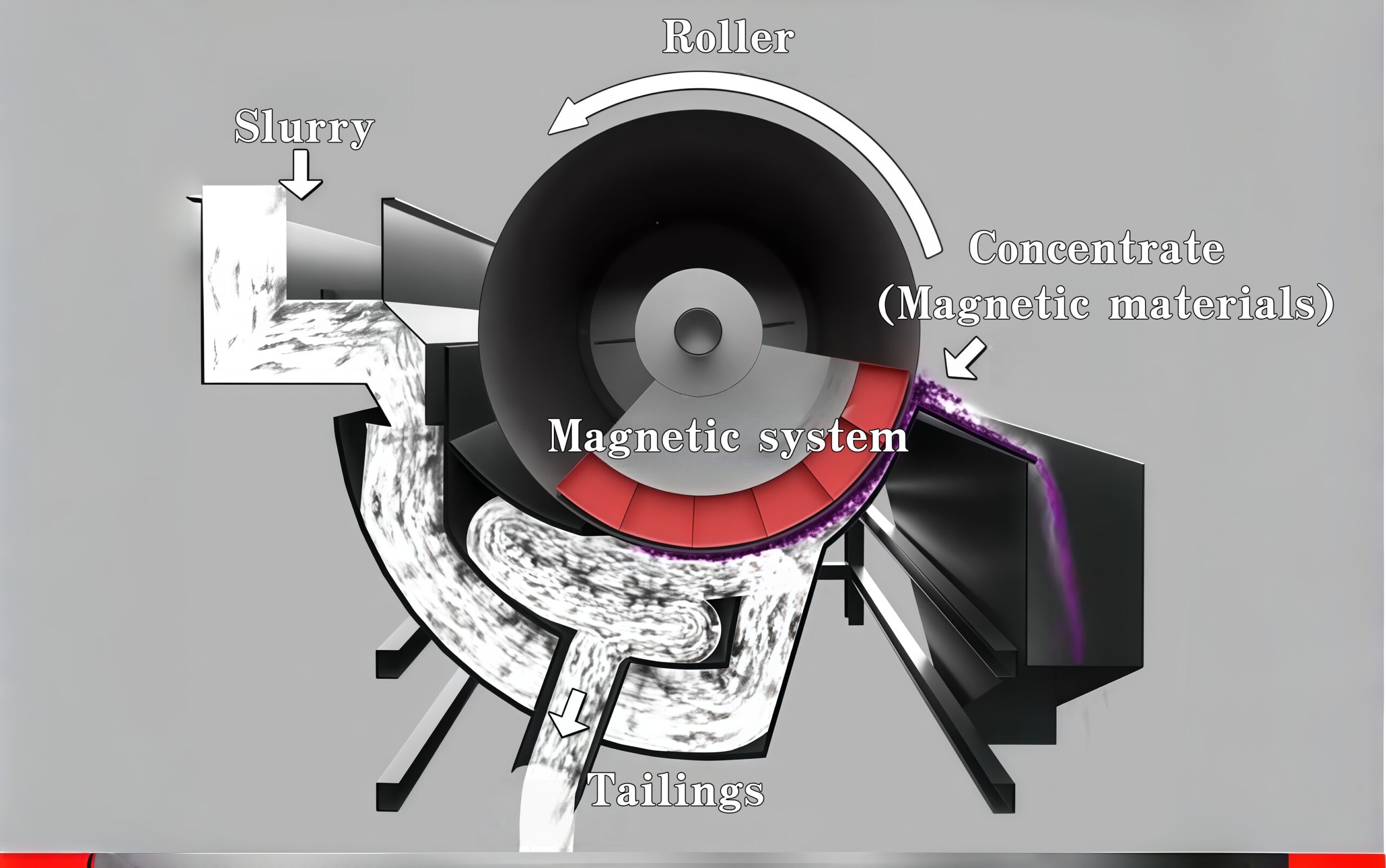 For iron-copper ore, the magnetic separator first recovers iron concentrate, with non-magnetic slurry proceeding to flotation for copper recovery.