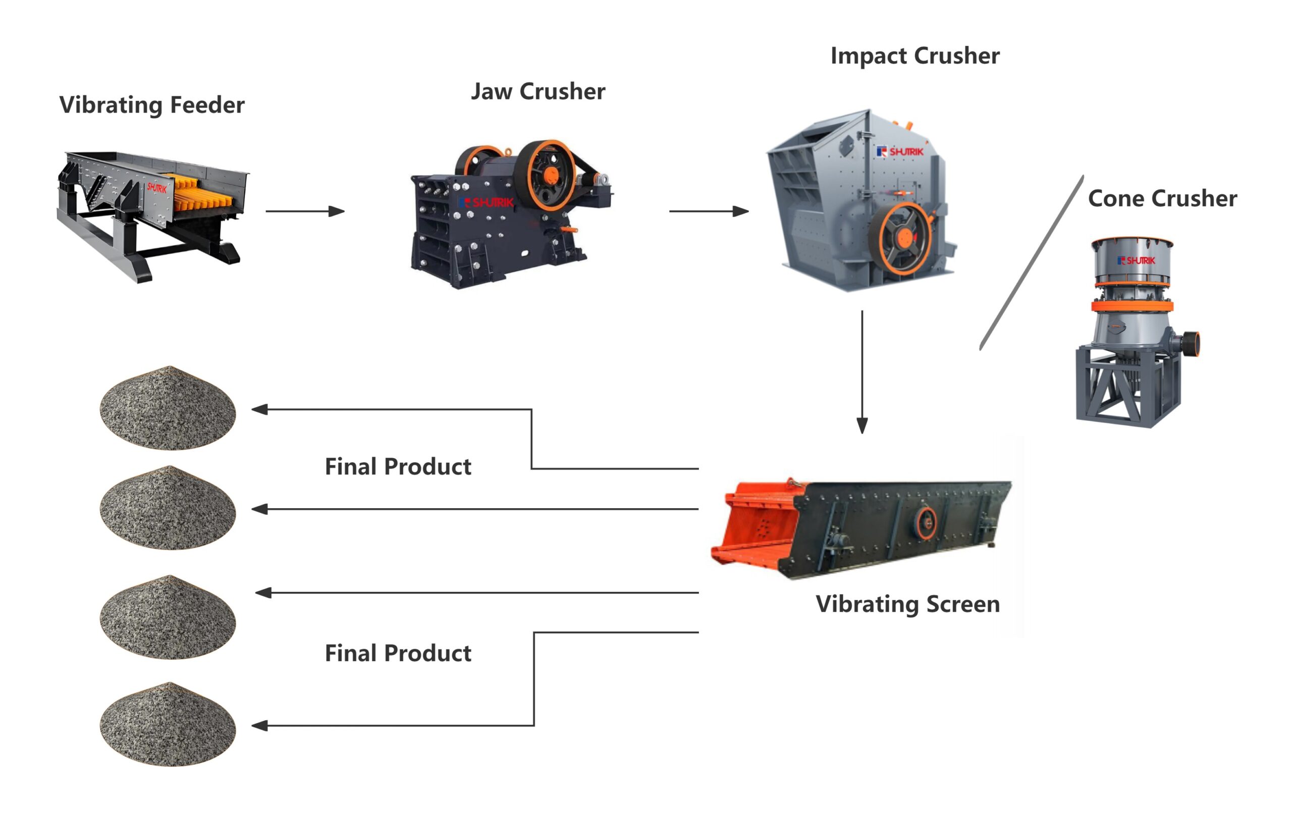 This 50-80-T/H Stone Crushing Plant scheme designed by Sandreck Mining Machinery is tailor-made for small and medium-sized sand and gravel plants, stone processing, and construction waste recycling projects. Under standard conditions with raw material moisture ≤8%, the maximum production capacity can reach 85 tons per hour.